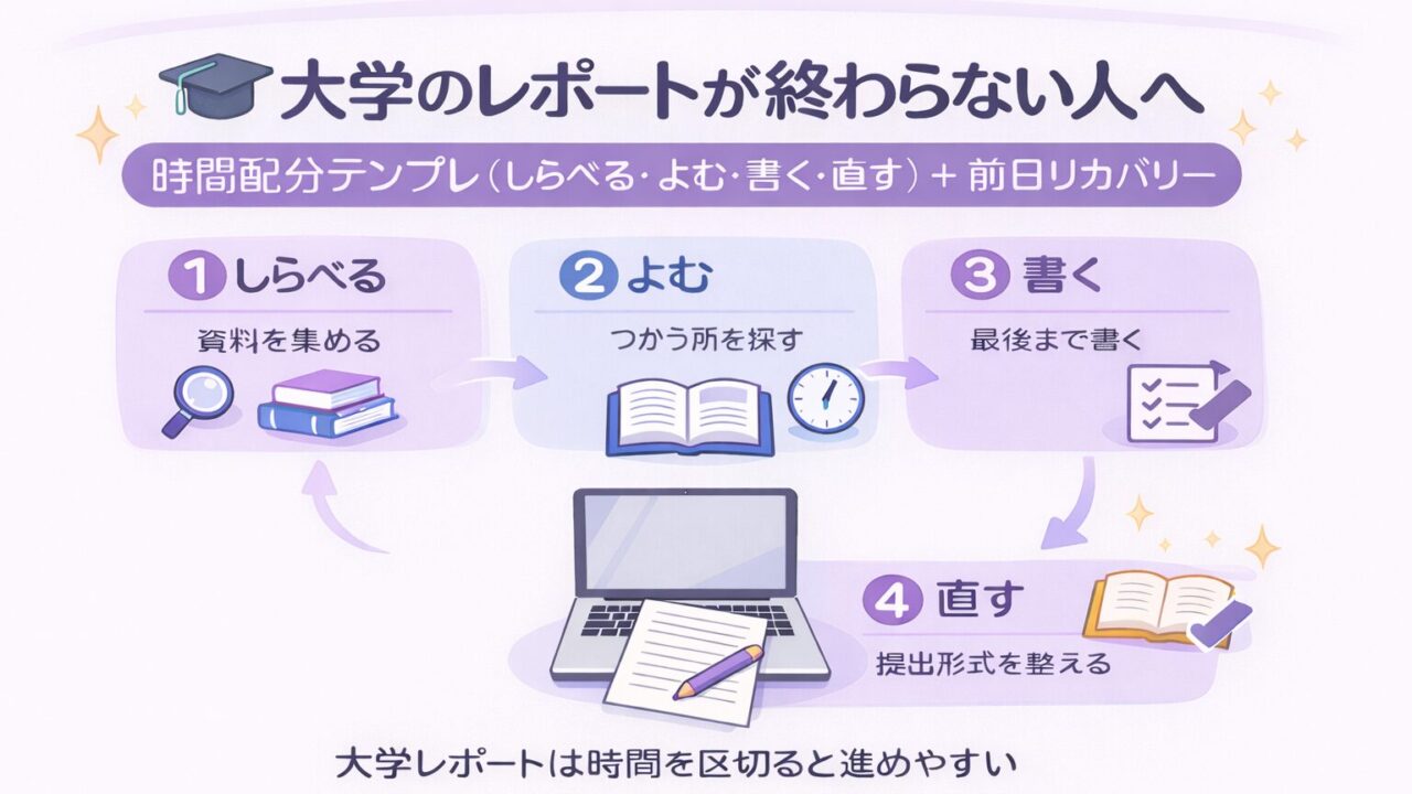 この蚘事では、倧孊のレポヌトが終わらない人向けに、時間配分の基本テンプレをわかりやすくたずめたす。
